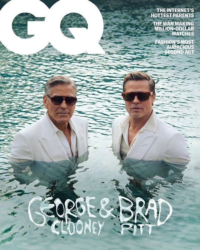 Meanwhile, George Clooney is busy telling off Quentin Tarantino for saying he’s not a movie star in the pages of GQ, between suited swimming pool dips with Brad Pitt, with nary a shout about either of their attitudes. (Every men’s magazine’s favourite styling trope, hilariously.) It that were Julia Roberts saying the same of Sofia Coppola, I wonder if it would get the same fairly muted reaction.